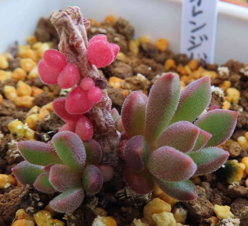 先端をカットして仕立て直したオレンジドリームの残りの根元の部分から,時季外れの鮮やかなピンク色の子株がいっぱい出てきた。小さいながら,すでに細かい毛のようなものが一人前に生えそろっている。