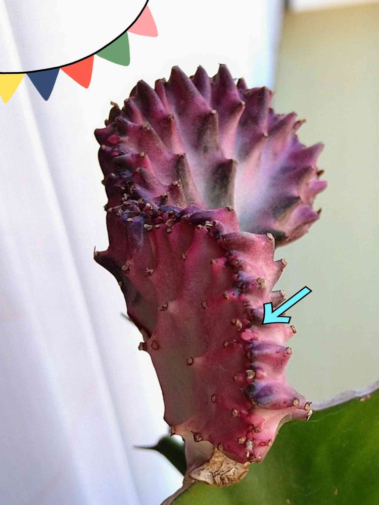 矢印の先のピンクの粒っとしたのがはっきり出てきて、綴化した成長点がなんだか緑っぽくなってきたように感じます🌵また🆙しますね🐸💡