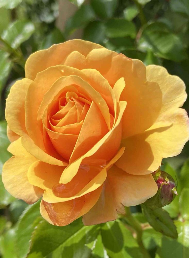 オレンジがかった黄色で、花びらの下の方に水がたまっています。