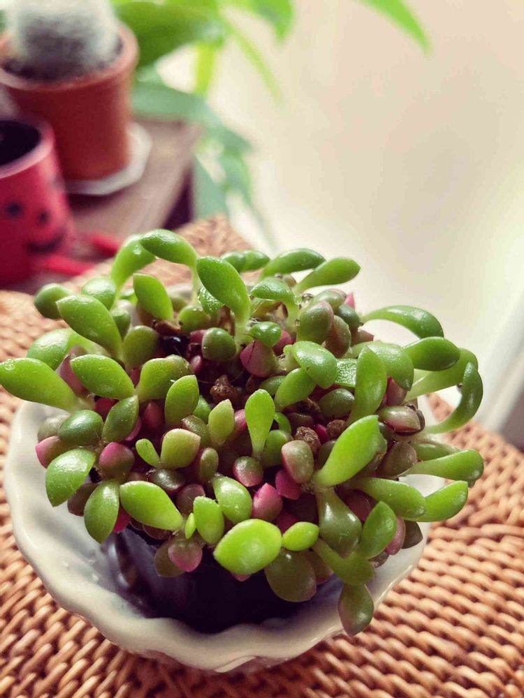 お迎えした時のままの直径4センチ位のミニ鉢に入ってます。植え替えしないといけないのでしょうが、バラバラになりそうで、なかなか出来ません。どーしたものか…。暑くて外出れないから、室内の多肉ちゃんと会話してます💕😰💦