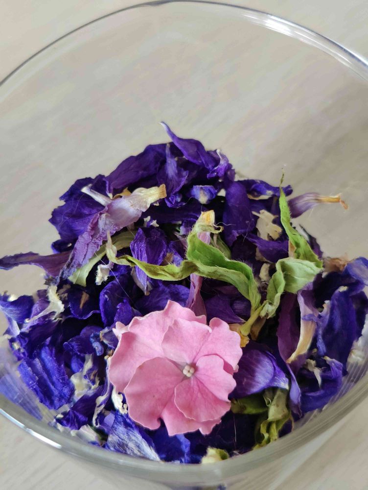 今朝水やりをしている時に落ちてしまった紫陽花(これは乾燥させてない)と一緒にドライフラワーカクテル🍸