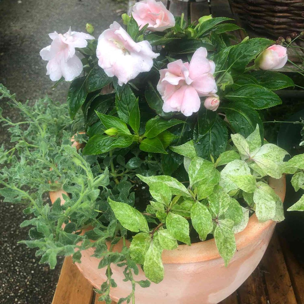 ニューギニアインパチェンス ワイルドロマンスと斑入りのムラサキシキブ、這い性のキンギョソウの寄せ植えです🪴