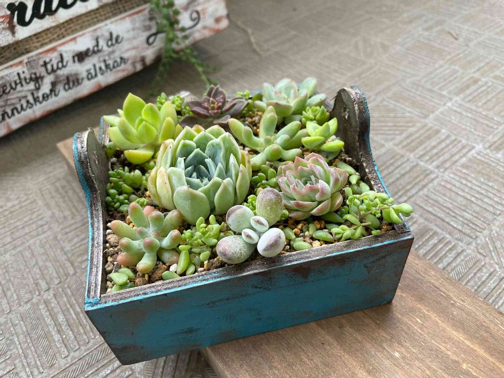 100均の木のBOXをペイントしてダスティ加工してみました。多肉ちゃんのお弁当みたい🤤夏なので丼にしてみました💕