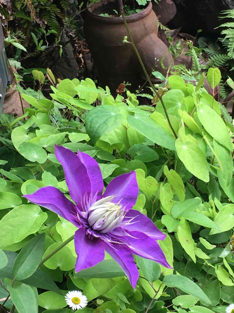 明るいグリーンのイカリソウの葉がクレマチスのパープルを引き立ててくれてます