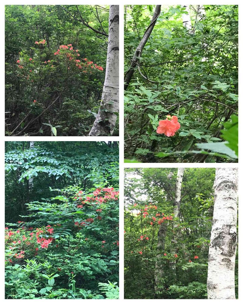 秋に来た公園ですがもう一度訪ねてみました 紅葉見た世界から一気に緑一色の中に橙色のツツジが至る所 樹高の高いシラカバに下を見ること忘れました