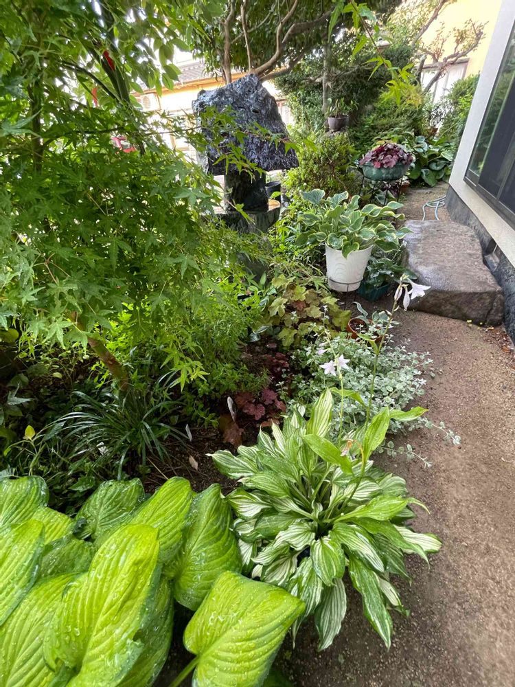 ギボウシや色んな種類の緑の涼しげなお庭ですね