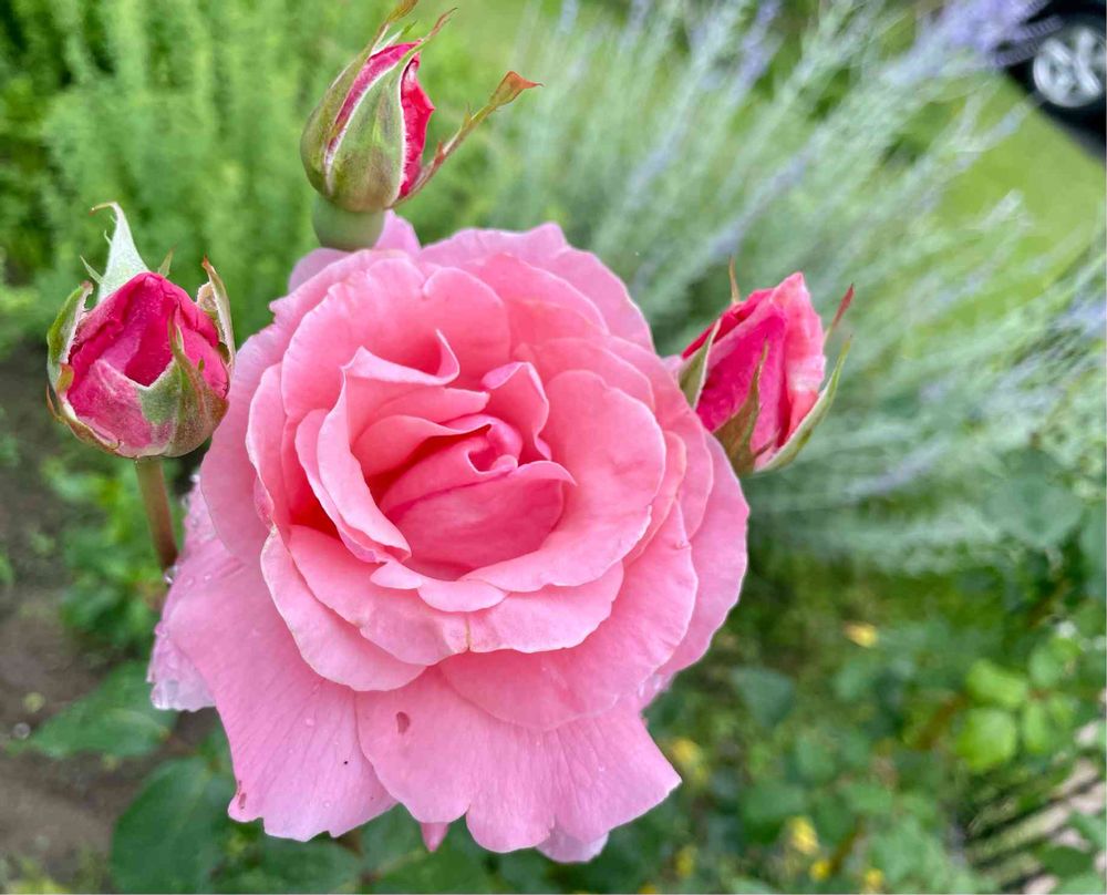 今年はホント綺麗に咲いてくれました。地植え四年後のクイーン・エリザベスさん。背景にはロシアンセージさんが元気に従っております。