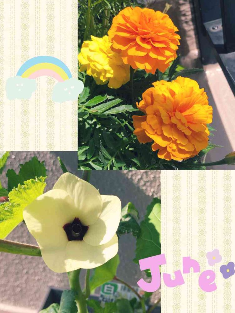 梅雨明けして暑いけど マリーゴールドやオクラのお花 元気に咲いてるの見ると こちらまで元気貰えるね💓💞