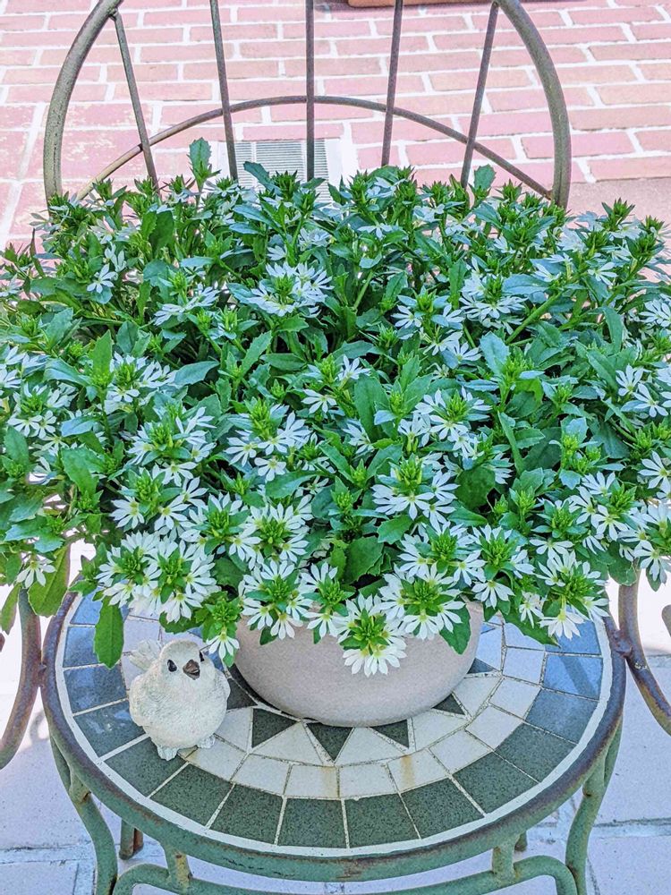 お庭におしゃれな椅子に鉢涼し気な満開の🤍のお花素敵💗