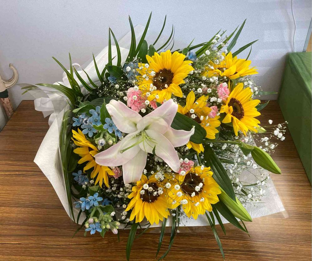 こんにちは。素敵な花束ができましたね。故人を偲ぶご家族も喜ばれる事でしょうね。