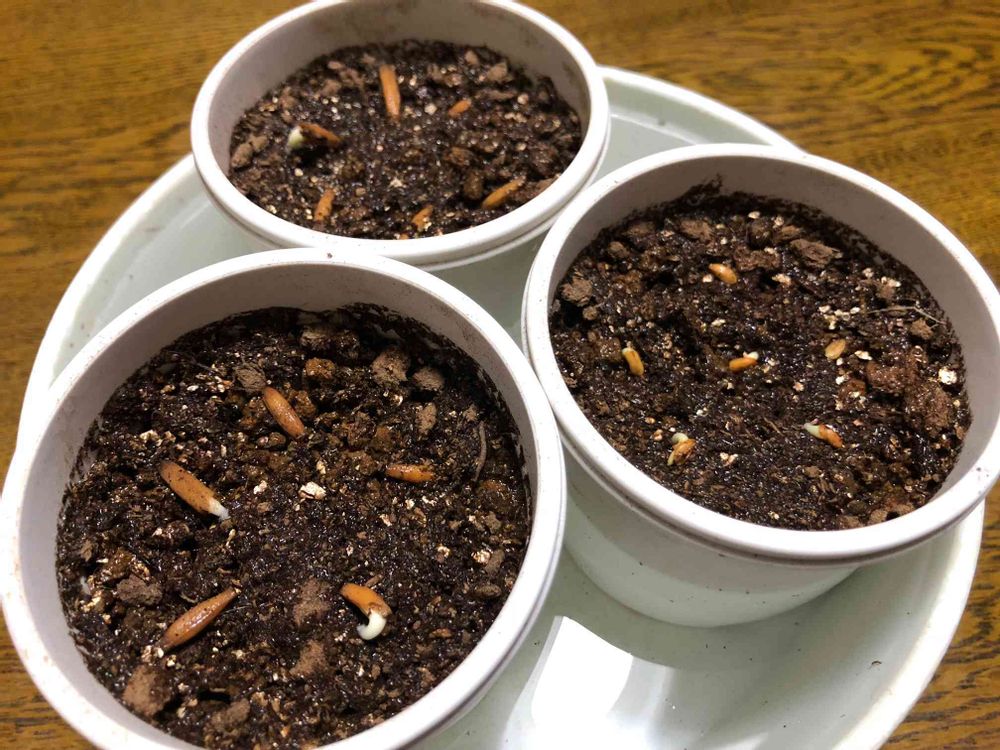 実生4日目。パキポディウム ブレビカウレが6粒中4粒、アデニウムオベスムが11粒中4粒が発芽!嬉しいな!カビが生えませんように!