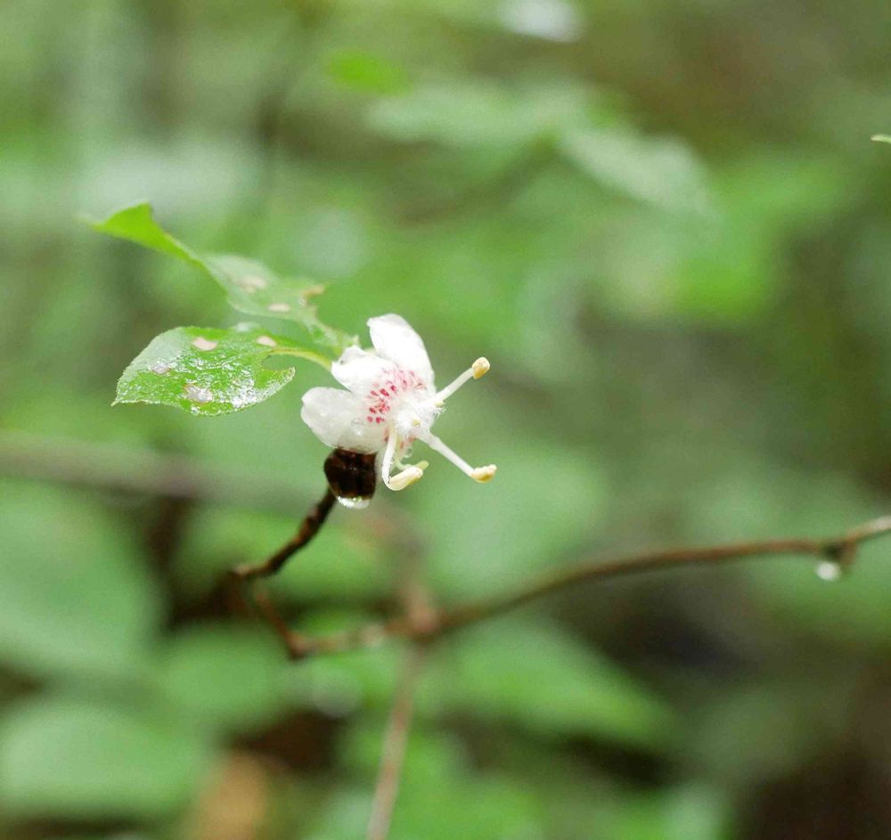 葉が展開した後に、枝先の葉っぱの下に花をつける。