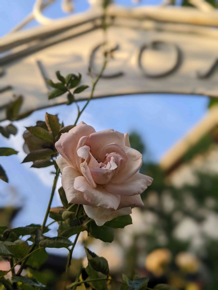 Welcomeのアーチと青い空とローズが素敵な色合いですね🤭💕
