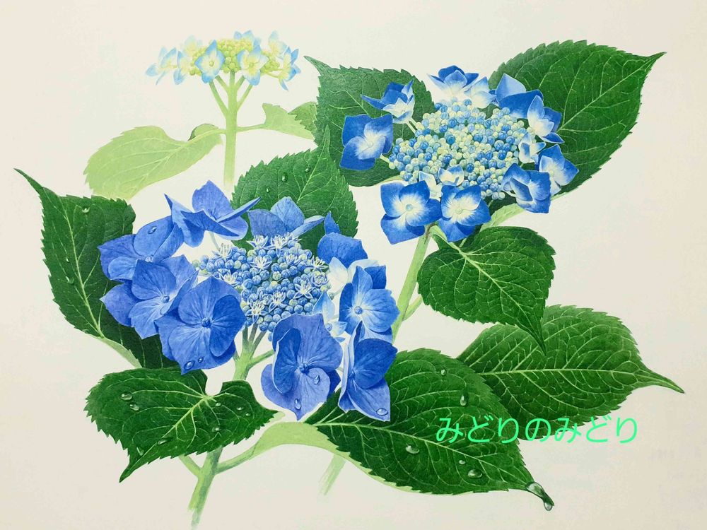 みどりのみどりさんのガクアジサイ ・ブルースカイ,庭の花,水彩画の投稿画像