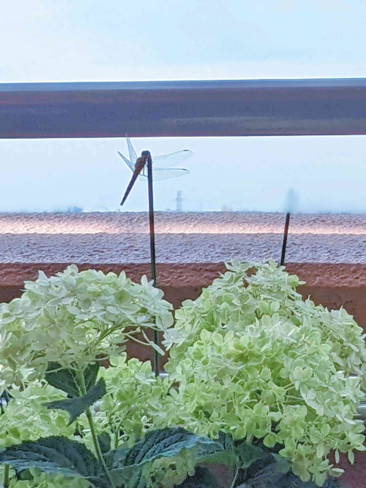 ライムのアナベルに立てた支柱が気に入ったようで、昨日からトンボさん遊びに来ています😊