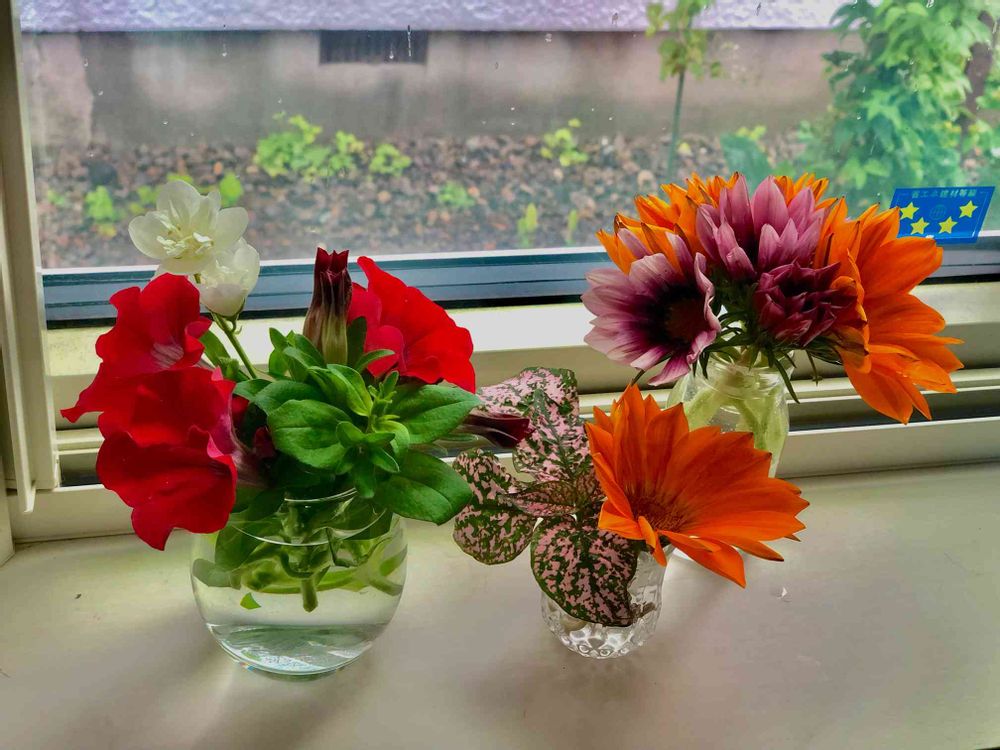 雨なので切り戻し部隊を窓辺に飾る遊びしました🌸華やか〜!