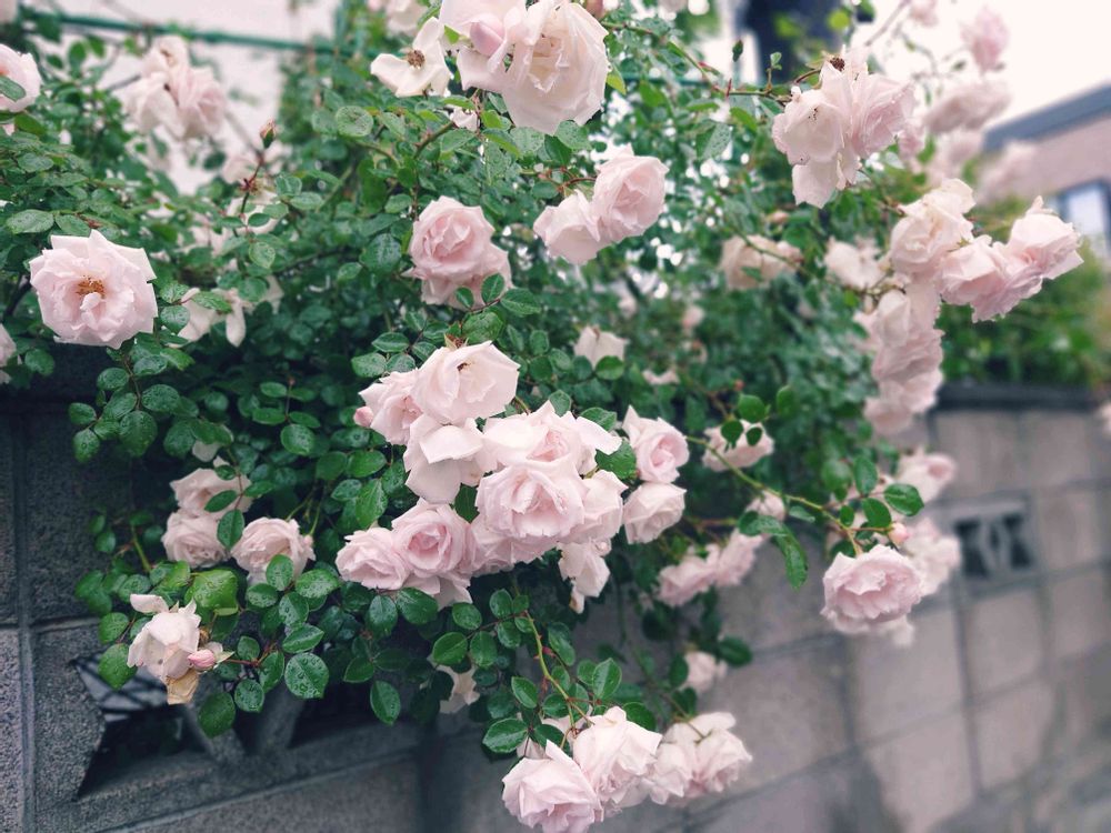 ブロック塀に仕立てたつるバラが沢山咲いてきました🌹