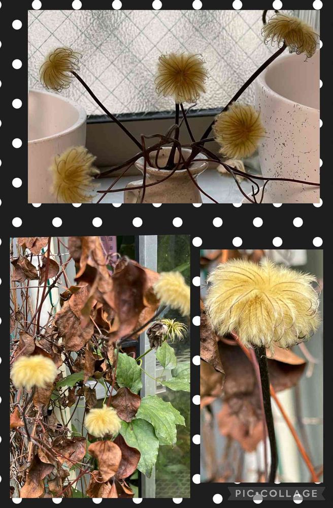 庭のクレマチスの種がドライフラワーのようになっているのでカットして小さな花瓶に入れました😊