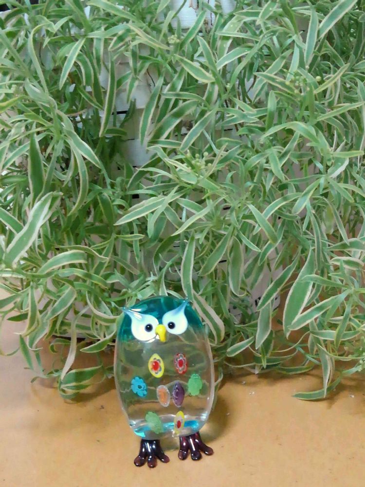斑入りの葉っぱが涼しげなアリッサムの木陰で 涼む ガラスのフクロウさん🦉✨