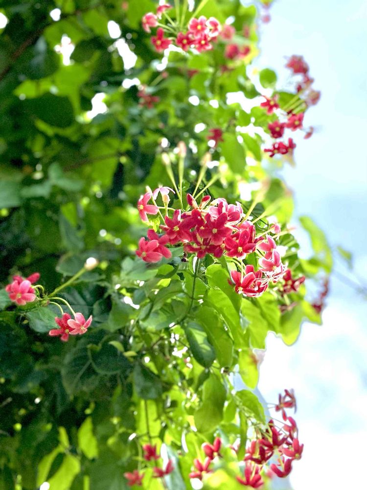 海沿いのベンチの上の棚からお花が降ってました〜🌸🌸🌸