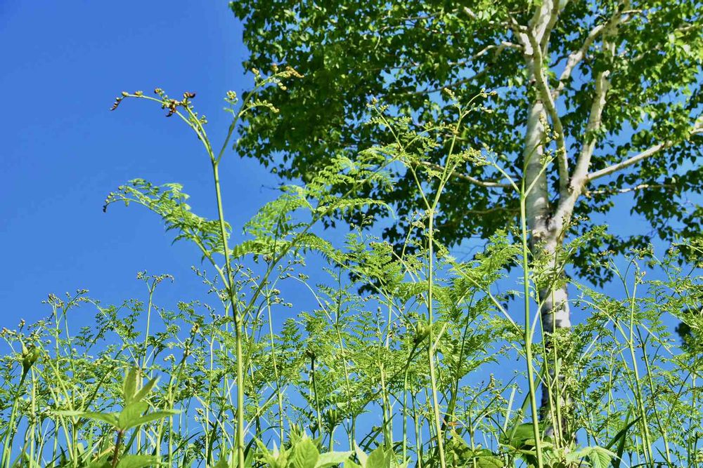 抜けるような青空を背景にニョキニョキと伸び上がっているのは「ワラビ」でしょうか⁉️ 斜面一面にこれが大群生してました💚