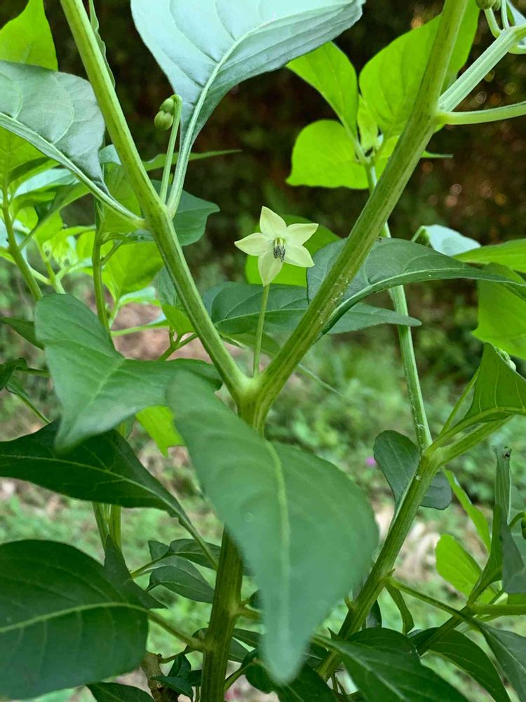 地植えした島唐辛子🌶が咲きました😀去年の脇芽を挿し木して、冬越しした苗です😁以前は春に苗を買って育ててましたが、花が着くのが遅く、年越しした苗の春からの立ち上がりが早いので、挿し木するようになりました😀GS2年生になりました😊