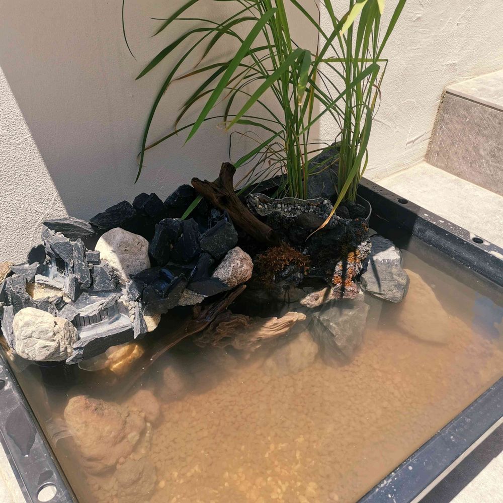 作り途中のメダカビオトープ、あとは水草植栽して、メダカちゃんを放つ、バケツ稲から拝借した稲を植えたけど水が富栄養化しそう…早速アマガエルちゃんが来てオアシスとなってる♪