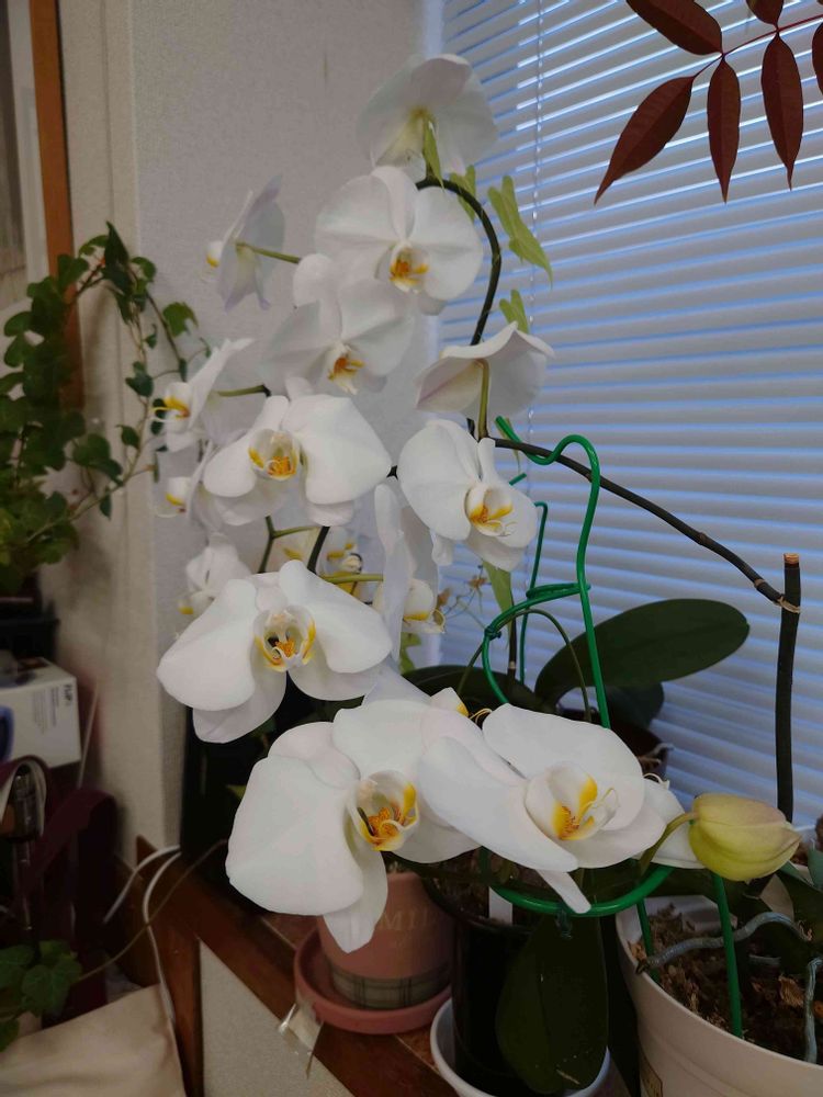 事務所の窓辺の胡蝶蘭がこんなに。写真は二株分です。一株は昨年の枝から、もう一つは新芽からです。三年目のお花です😁❣️。