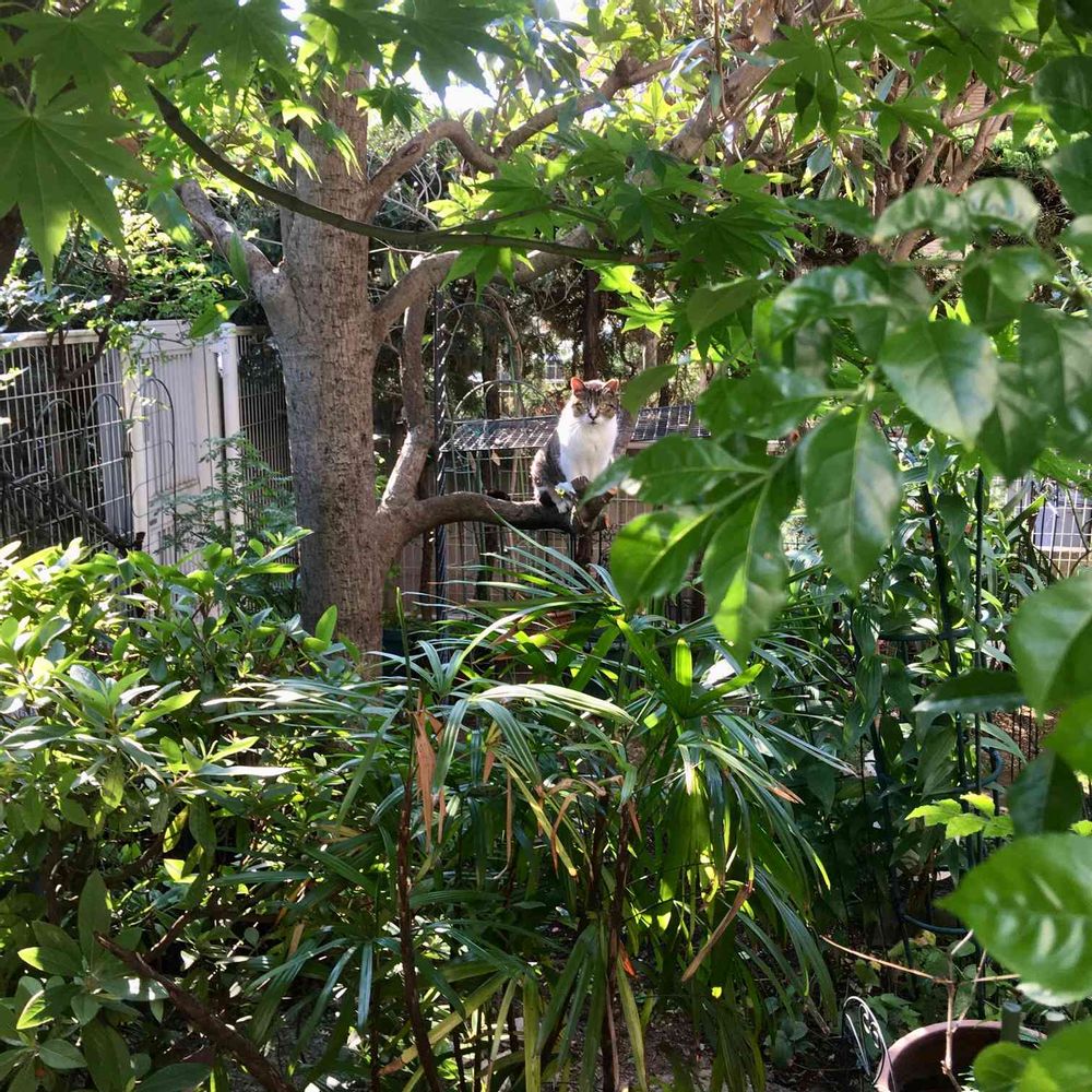 自転車置き場の突き当たりから、フェンスで仕切られた1階のお宅の専用庭ジャングル。早朝の水遣り💧💦で打ち水効果で涼しげです。よく見かける野良猫🐱ちゃんが、まるでミミズク🦉みたいに木の枝にとまっています。