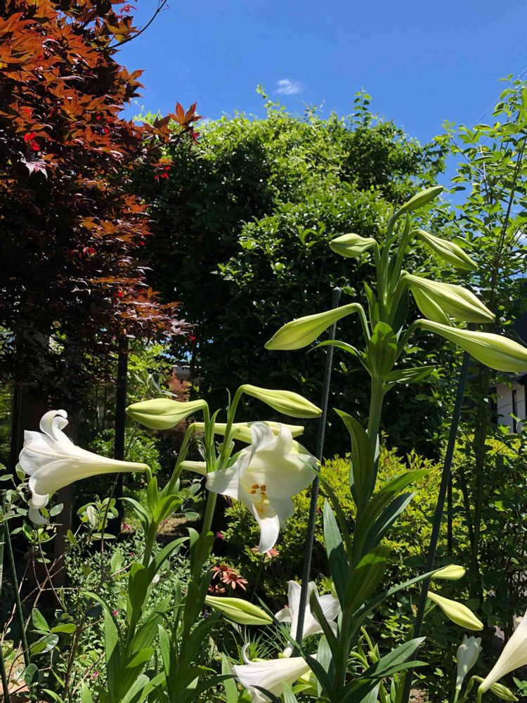 真っ青な空と深い緑、白いユリの花が涼やかなpicね。