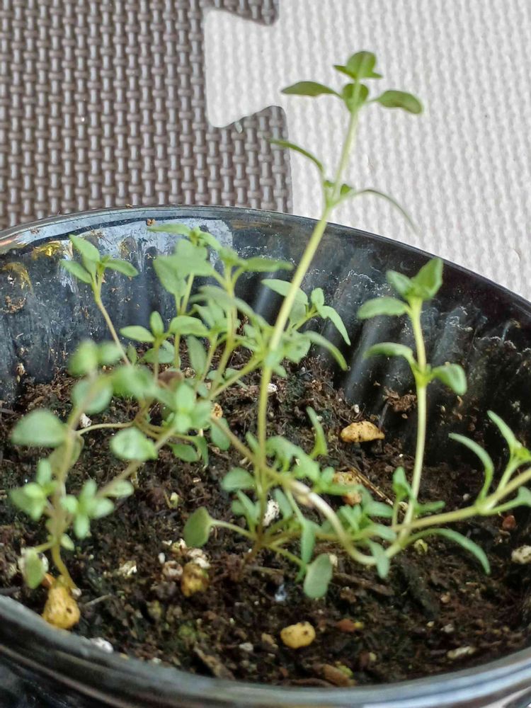 タイムっぽい感じですね。タイムは茎がもっと頑固な感じですが、若芽だからひ弱な感じなのかな?ちょっとちぎったら香りませんか?