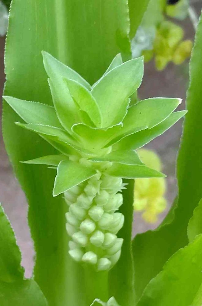 ユリ科で、パイナップルリリーとかパイナップルフラワーとか…ユーコミス・プンクタータ(我が家のは、生協でこの名前でした😅💦🎶)