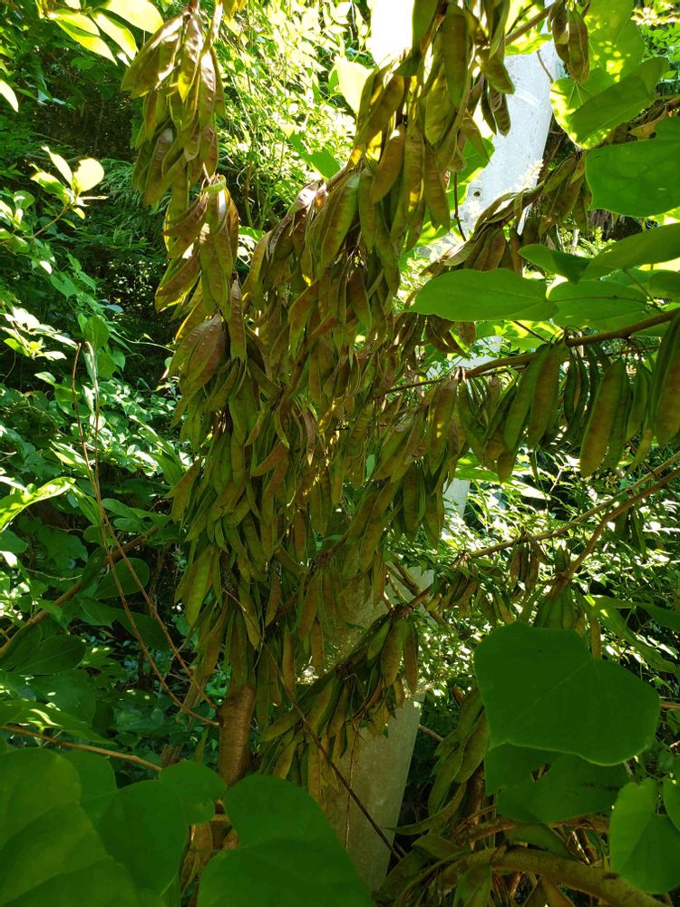 これって何の木でしょう?豆みたいな物が大量にぶら下がってるけど、豆科の木かな?