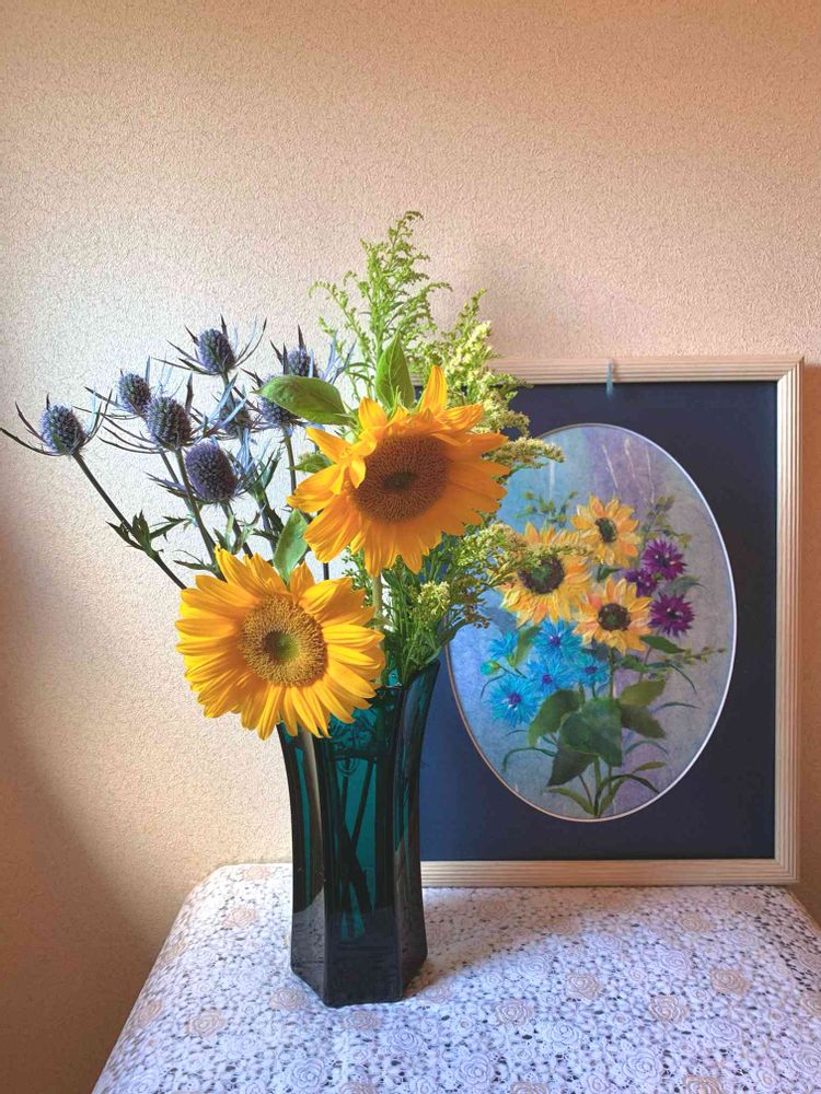 可愛らしいひまわりさんが涼やかに生けられてちぎり絵と相まってとても素敵なpicですね。♥️ これからも生花とちぎり絵のコラボ楽しみにしています。🙋🏼♥️