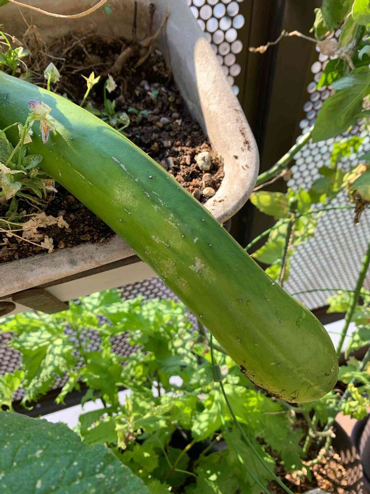 こんな巨大化したきゅうりがお花のプランターまで伸びて草花の根本に横たわってました🙀きゅうりの収穫はおわったと思ってたのでびっくり‼️