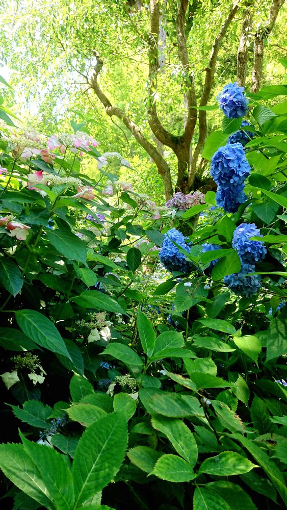 青い紫陽花の向こう側には、眩しい太陽、ここは木々が日陰を作ってくれて、爽やかな風を感じながら、散策を楽しむひととき、そんな雰囲気を感じますー