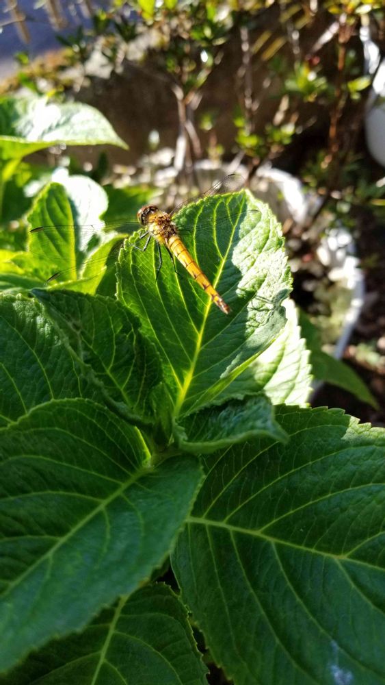 夕方、紫陽花の葉っぱでお休み中。水やりしても逃げない人馴れしすぎなトンボちゃん。もしかしたらこの家で生まれたのかな😉