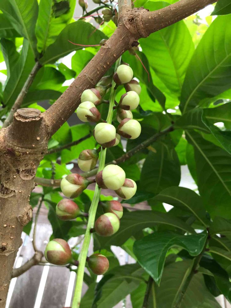 モノレール首里駅ホットモット側に降りてモノレール方向の信号から(シラン💜の咲いているとこの信号)ローソの右裏手側、に目をやると地味な大きな葉っぱの木に蕾がネックレスのようにぶら下がっていましたよ。