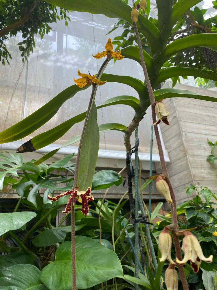 珍しい形のランだなと観ていまさたら、上は黄色、下はマダラ模様で、赤茶色の、2種類のお花が咲くのですね〜🎶😳💞