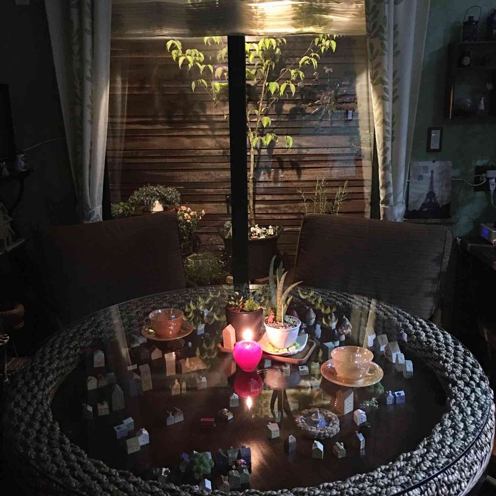 ダイニングキッチンの窓の外はカフェテラス。窓越しに見えているのはヤマボウシです。ダイニングテーブルの上には多肉植物を。植物を眺めながらゆったりとした気分でコーヒータイム。