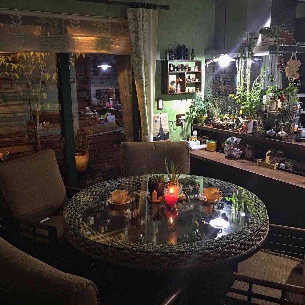 ダイニングキッチンの窓の外はカフェテラス。ダイニングテーブルの上には多肉植物を。対面キッチンのカウンターには観葉植物や多肉植物。植物を眺めながらゆったりとした気分でコーヒータイム。