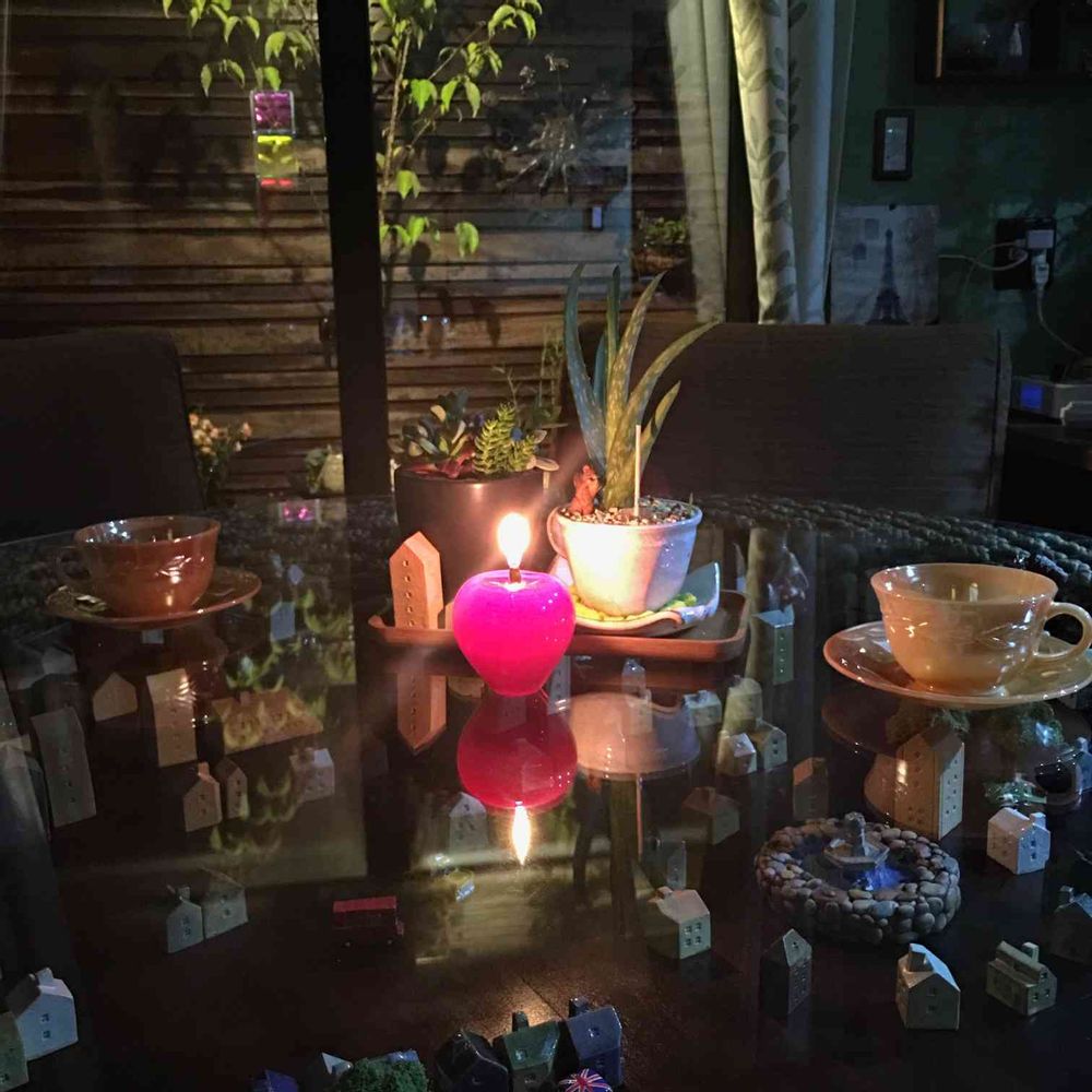 ダイニングテーブルの上に多肉植物を置いて、愛らしい多肉を眺めながらのコーヒータイム。