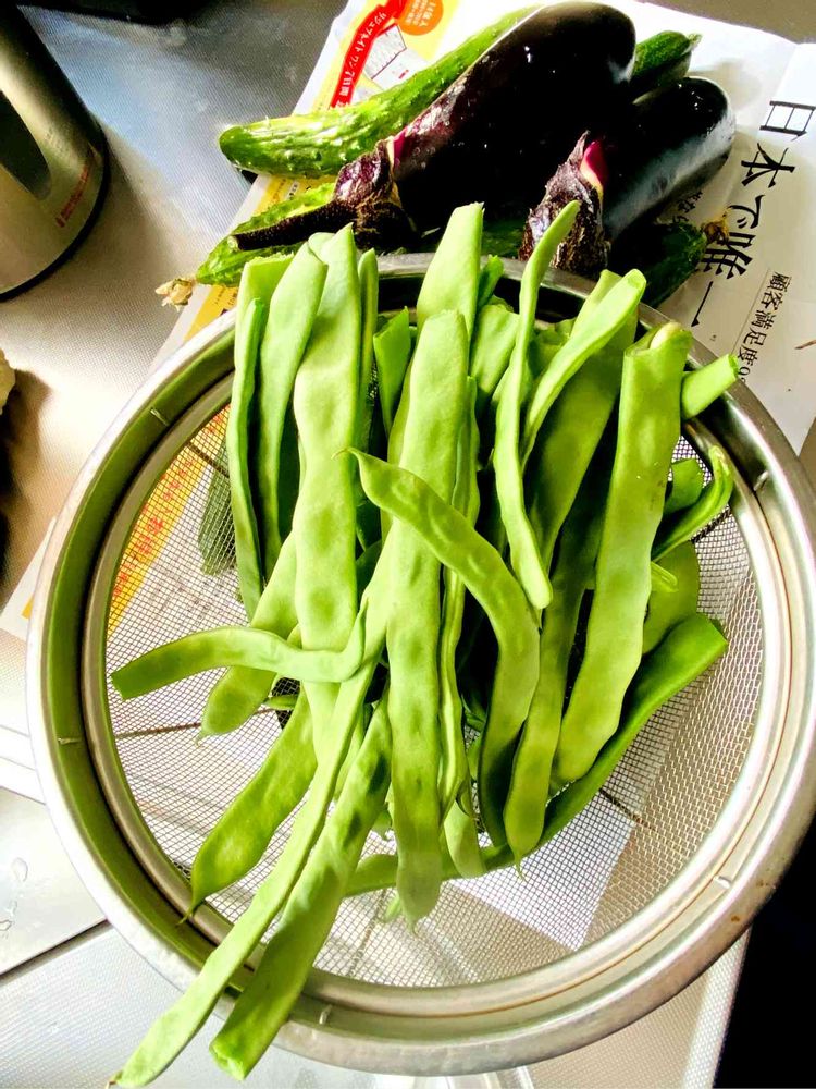 手前はお隣りさんが畑で手渡しでくださった採れたての豆です