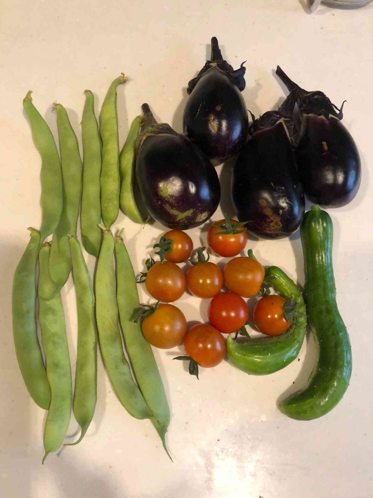 今日の朝どり野菜。インゲンの苗木がダメになりそうなのを収穫しました。きゅうりは強風で弱っているので、へなちょこの出来損ないが🤣大きくしても仕方ないから収穫😂