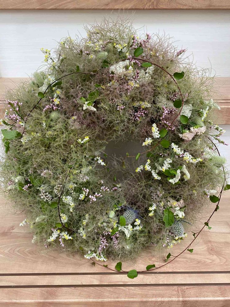 エミリンサン、スモ-クツリーを使用してのリース、柔らかな優しい感じでいいですね。💚💚💚ふわふわ感がたまらない❣️