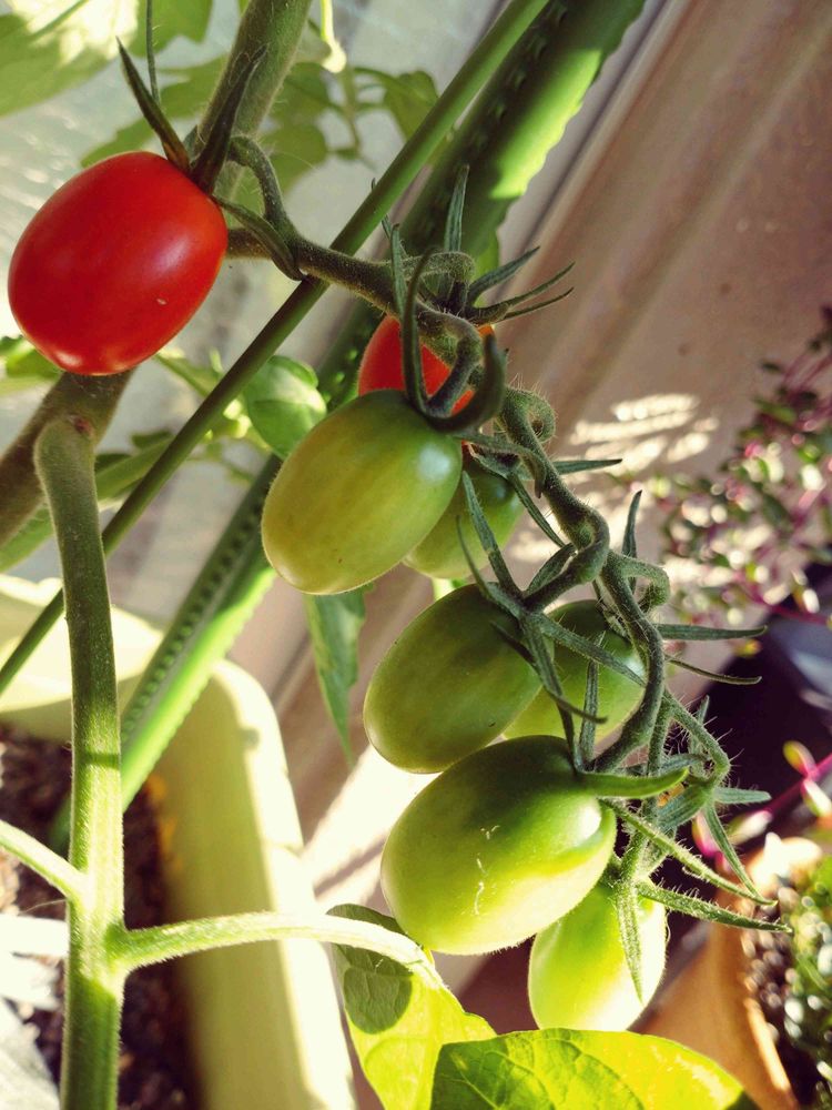 ミニトマトの実が一部赤く色付きました。他のはまだ青いので赤く熟した3つだけど収穫しました☺️
