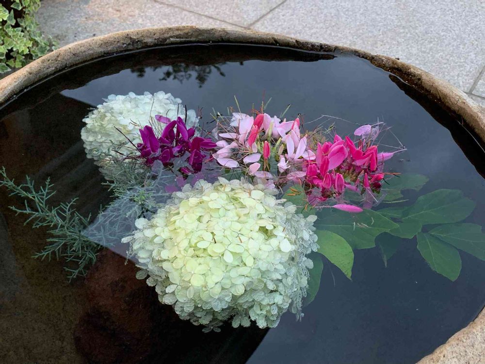 真っ白なアナベルとピンク色のクレオメの花手水💙🤍🌸🤍💙