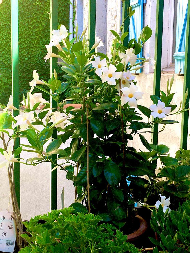 今年買ったマンデビラ🌸、仮置きでテラスのフェンスの前に置いといたら、あっという間にフェンスにツルを絡ませ同一化💦