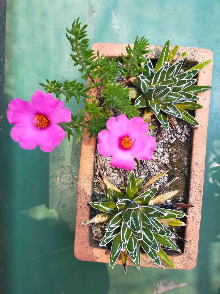アガベ【笹の雪】の鉢におじゃましたマツバボタン😍