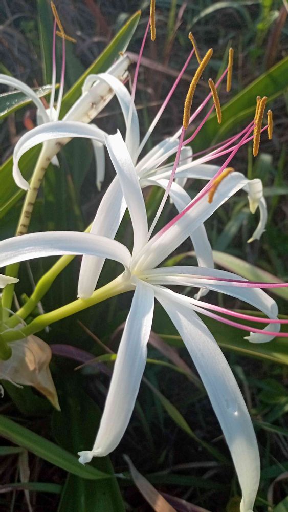 白く長い花びら 細く伸びる雄しべは白い手元から先に行くに従い朱に染まる。💕💕❤️🤗